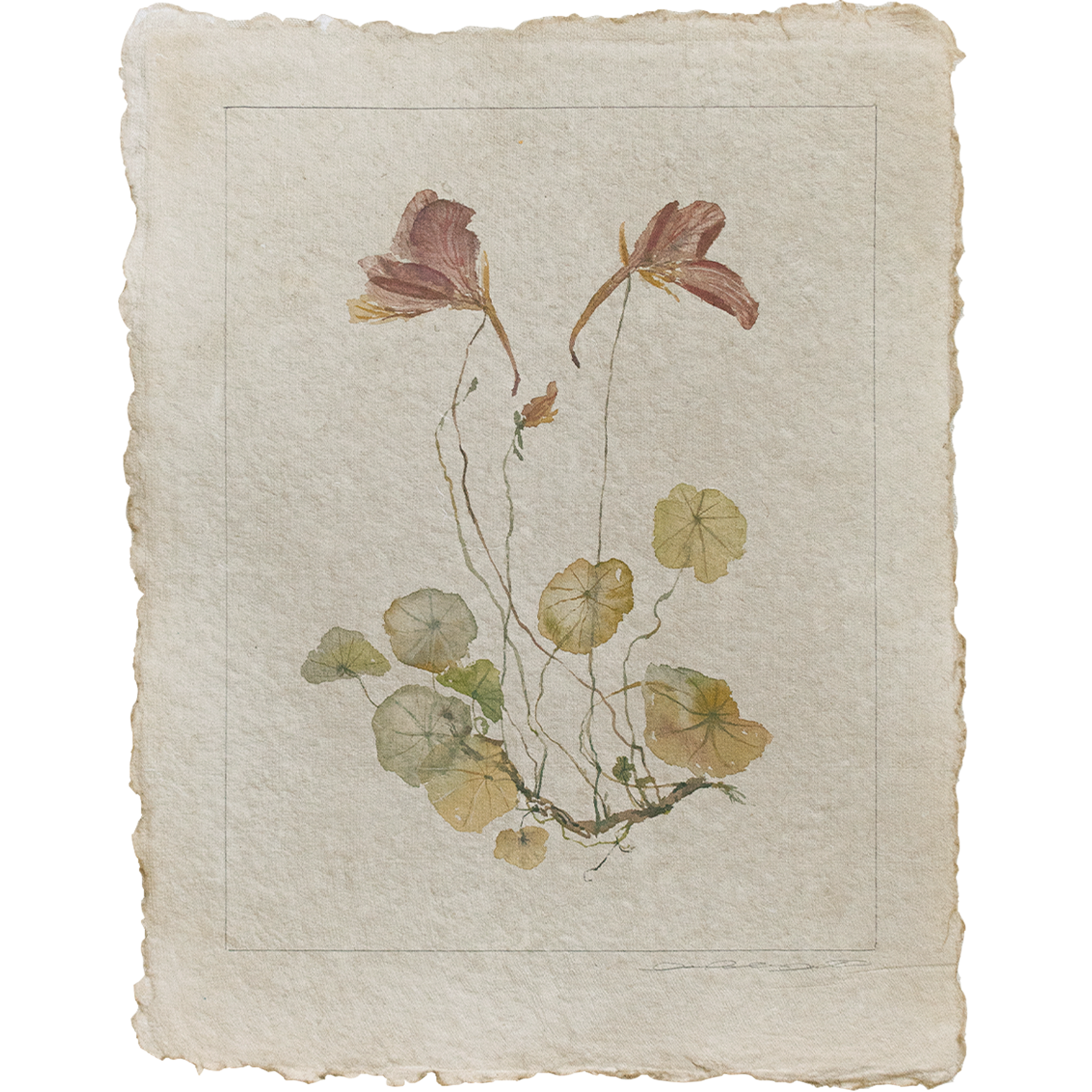 Mixed media work painted on handmade hand dyed rag cotton paper with a natural deckled edge.