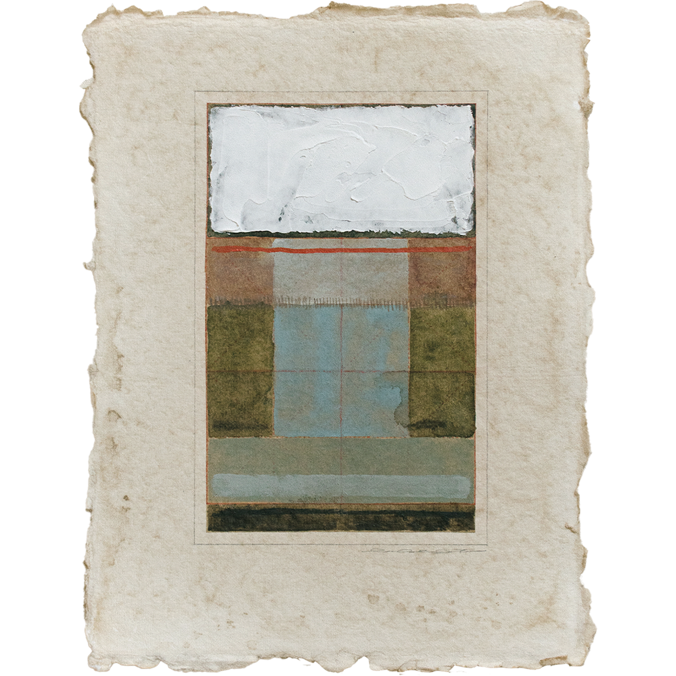 Mixed media work painted on handmade hand dyed rag cotton paper with a natural deckled edge.