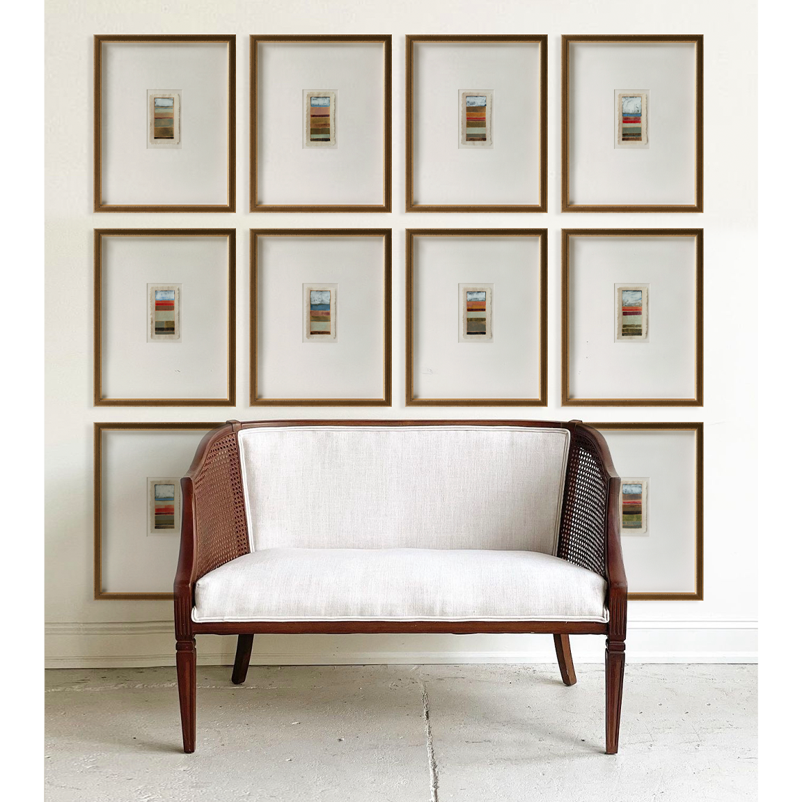 Custom frame with a 1/4” float mount on a linen textured warm white mat with a soft white outer mat. Framed in a muted gold, classic carved rope frame. Wired and ready to hang.